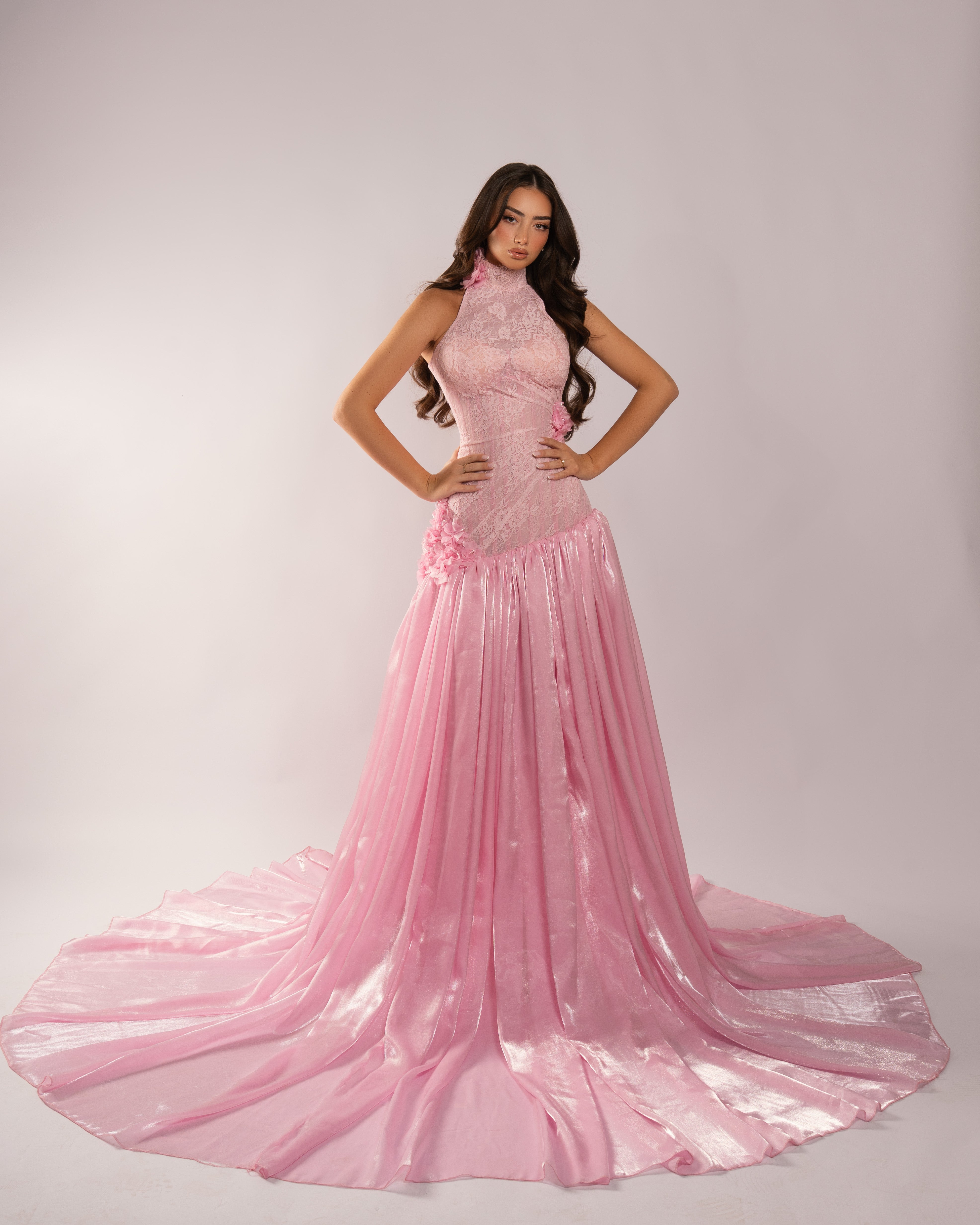 The Améline Gown by Noré is a vision of romance and grace. Crafted in delicate pink tulle with an elegant high-neck design, it drapes beautifully to create a soft, ethereal silhouette — perfect for evening occasions or galas.