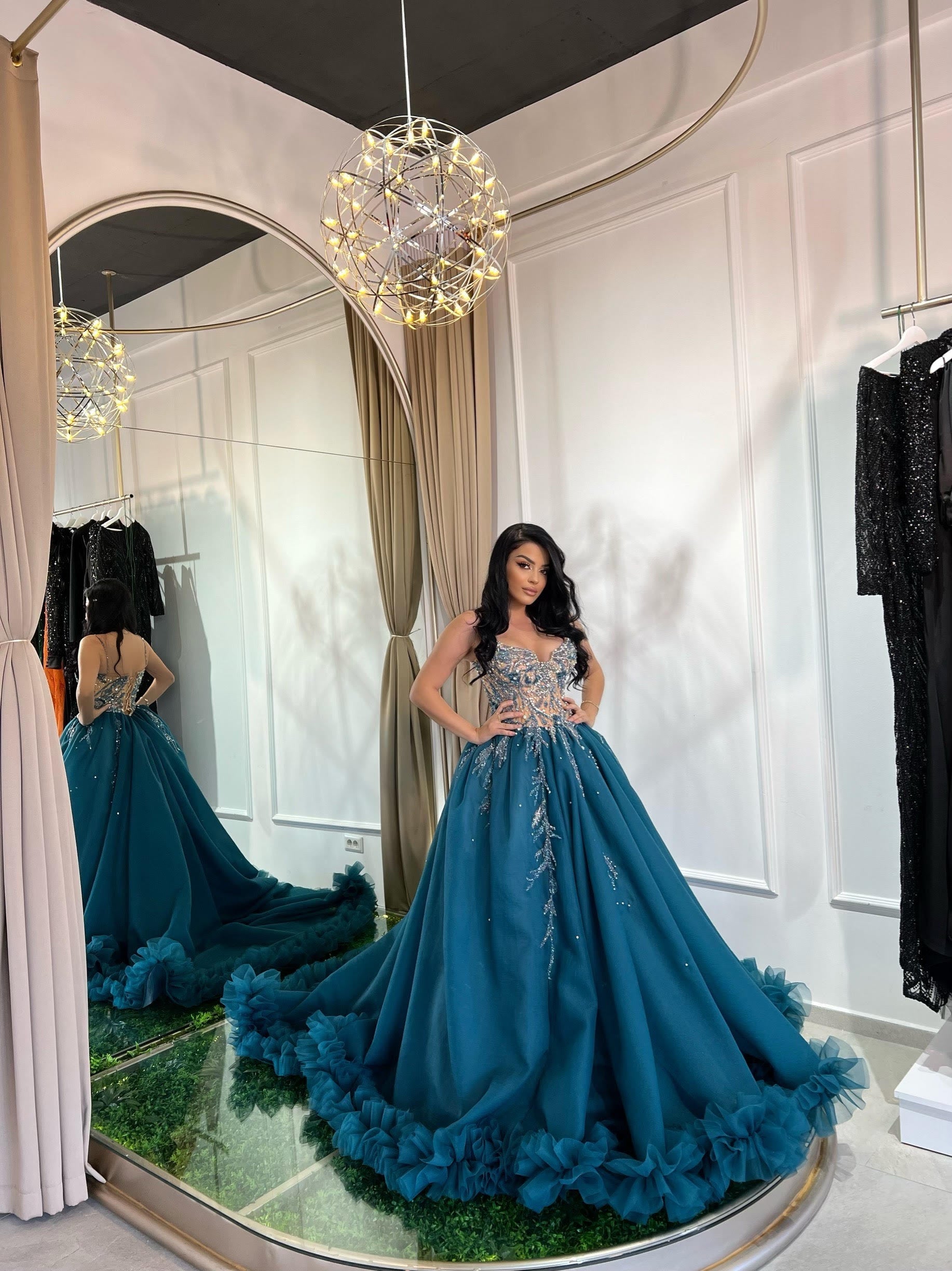 Featuring a corset embroidered with lace, beads, stones, including a layered long tulle skirt for a belle look.