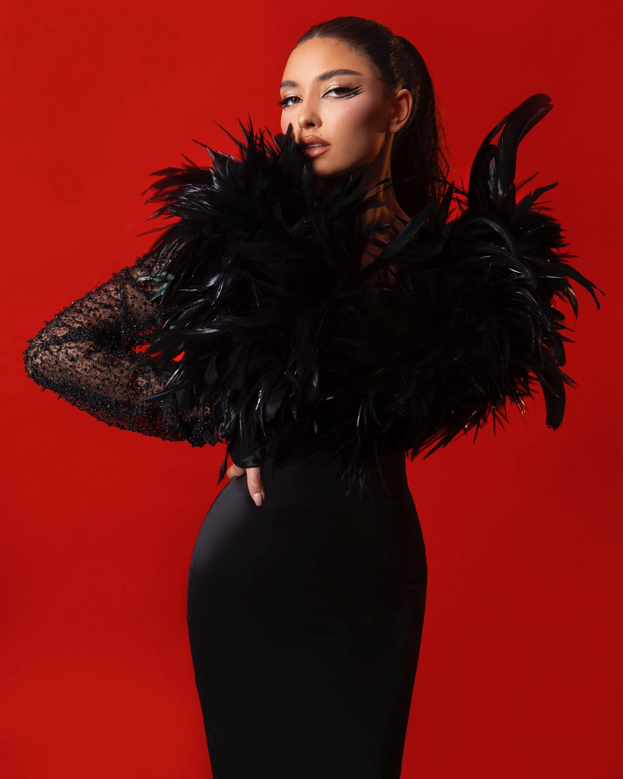 Open chest beautified with lace, black feathers, beads and stones.