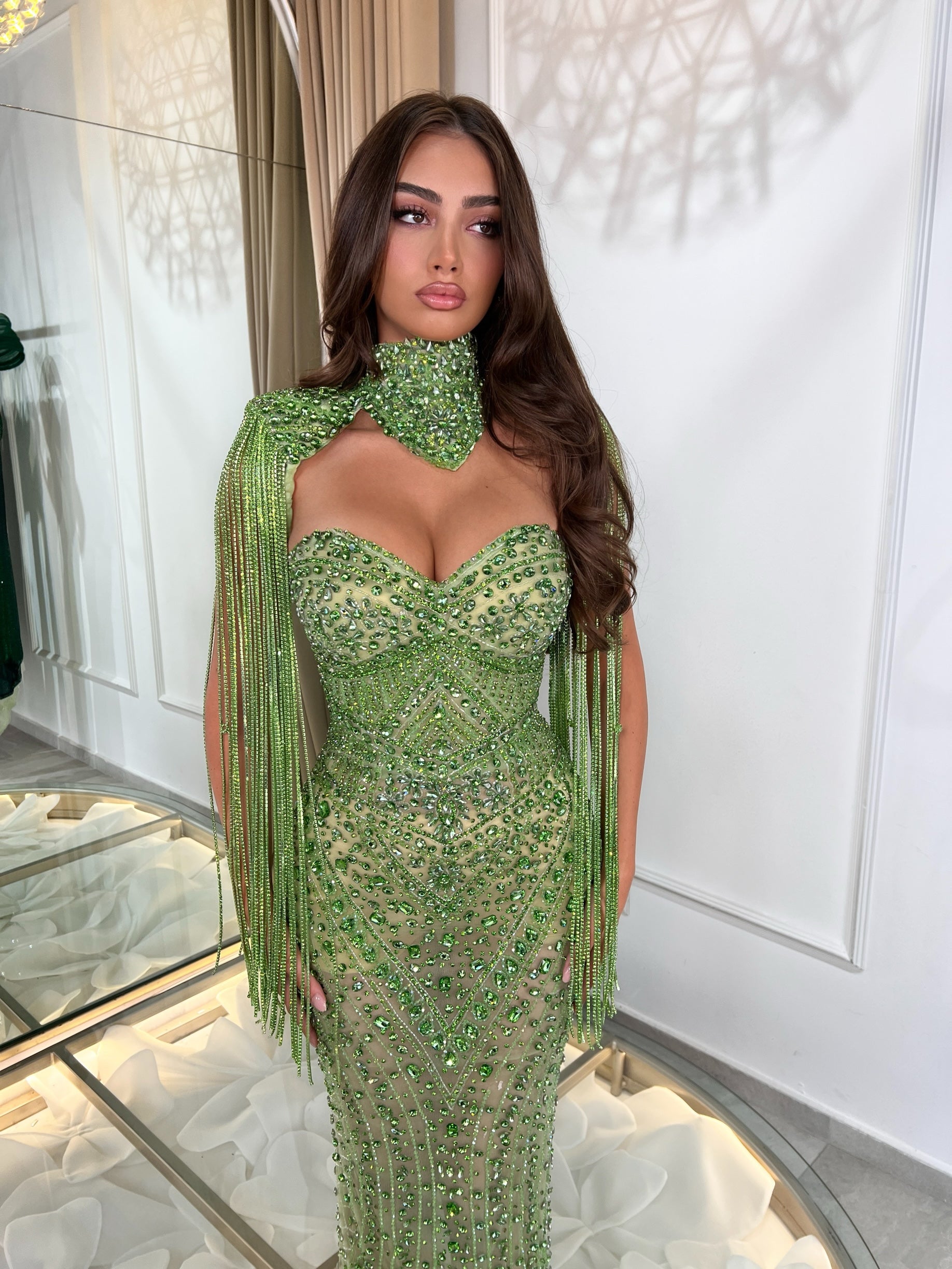 Adorned with hand-placed crystals and intricate beadwork, this design captures the essence of luxury. The structured corset enhances the silhouette, while the dramatic crystal-embellished neckpiece and cascading shoulder fringes command attention with every movement.