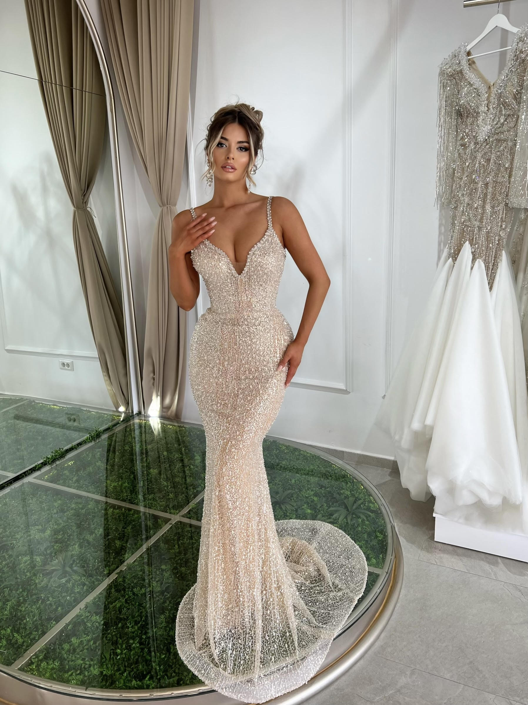 Nude Dress is a stunning mermaid silhouette gown designed to turn heads and transform your presence at any formal event. The dress hugs your curves and fans out into a graceful flare, creating a silhouette that is both sculpting and cinematic. Crystals and stones are artfully embedded to catch every glint of light, ensuring a radiant shimmer as you move.